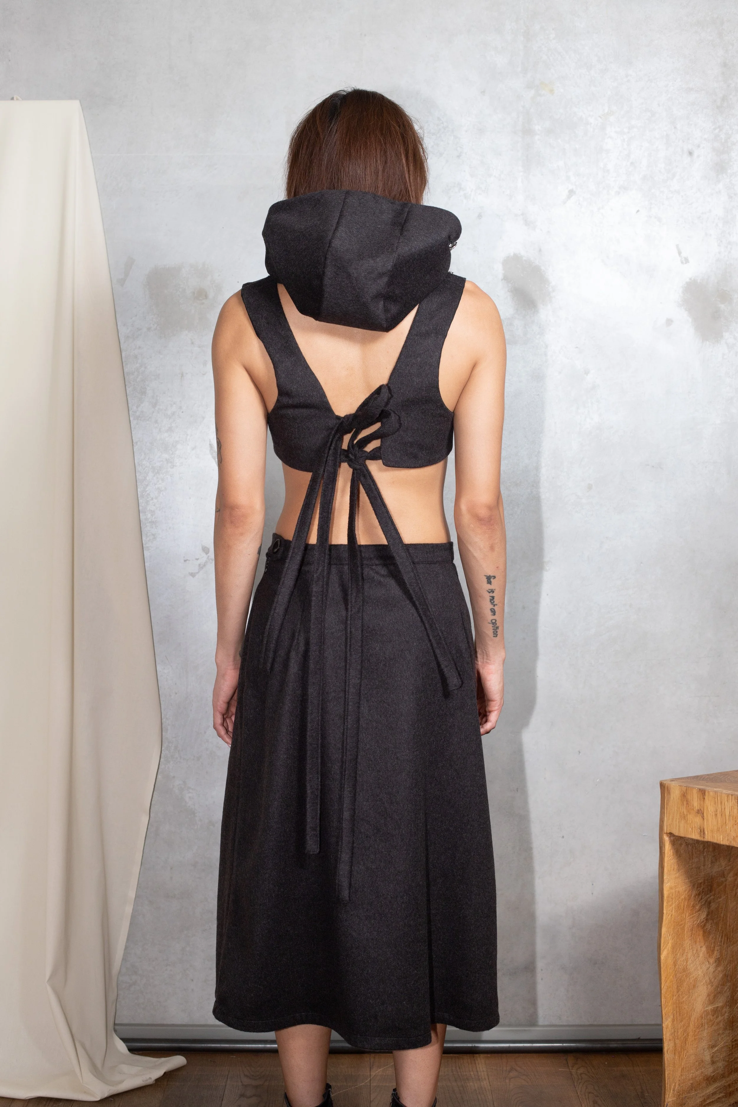 A sculptural hood made from Italian deadstock wool, hand-embellished with crystal applications. Designed as a modular piece, it can be styled alone or combined with the matching bolero and skirt. Designed and handmade in Berlin.