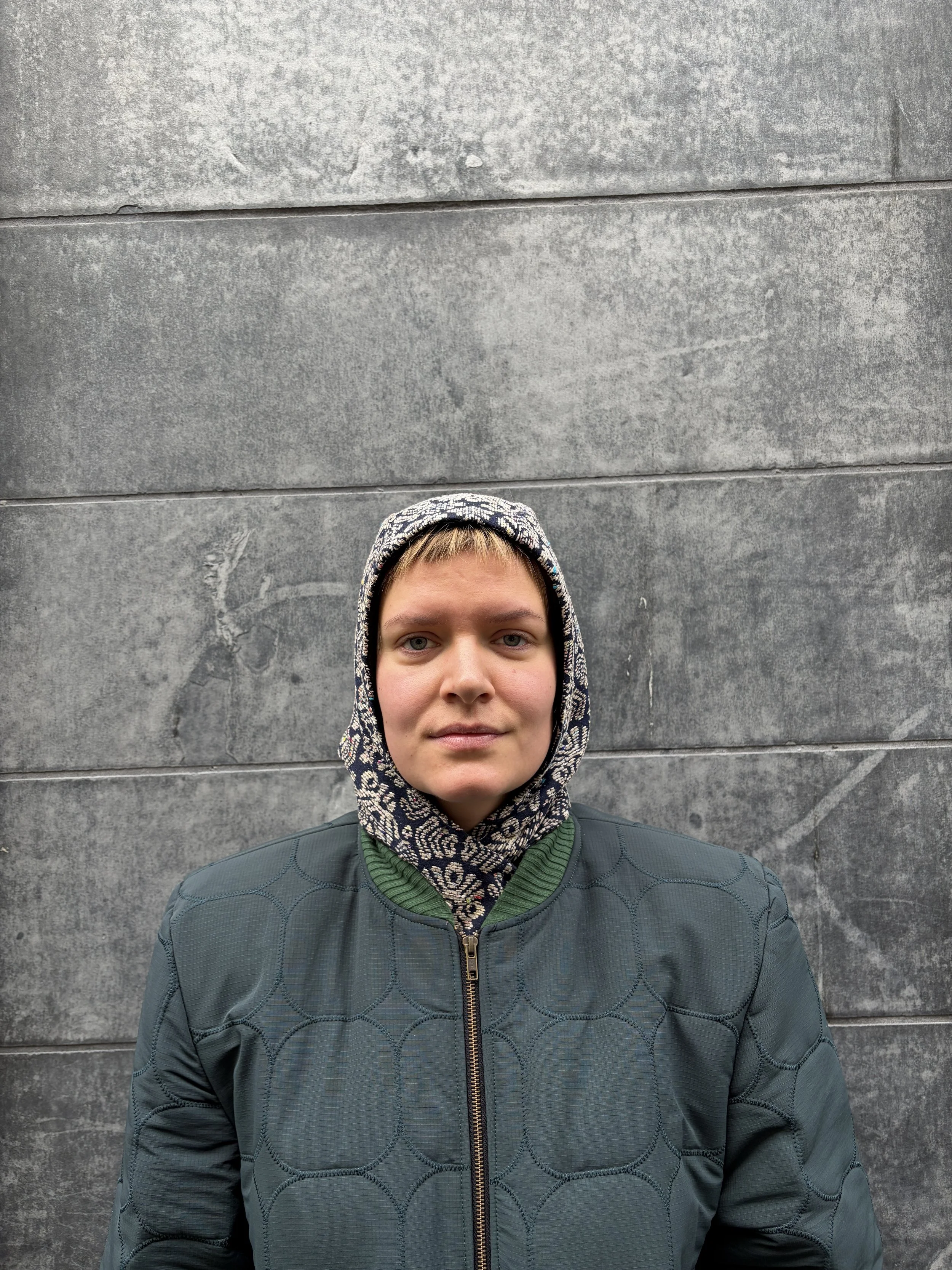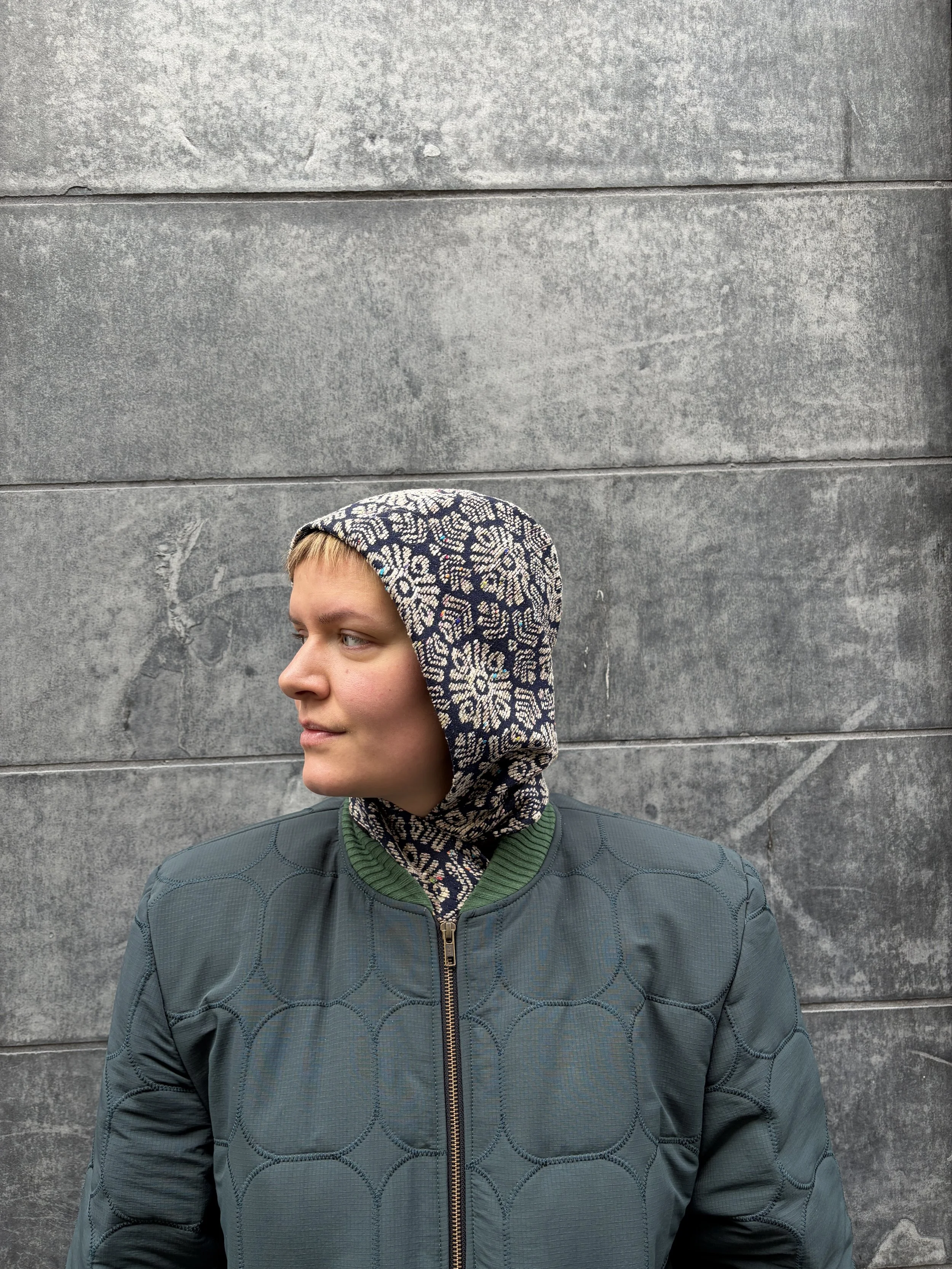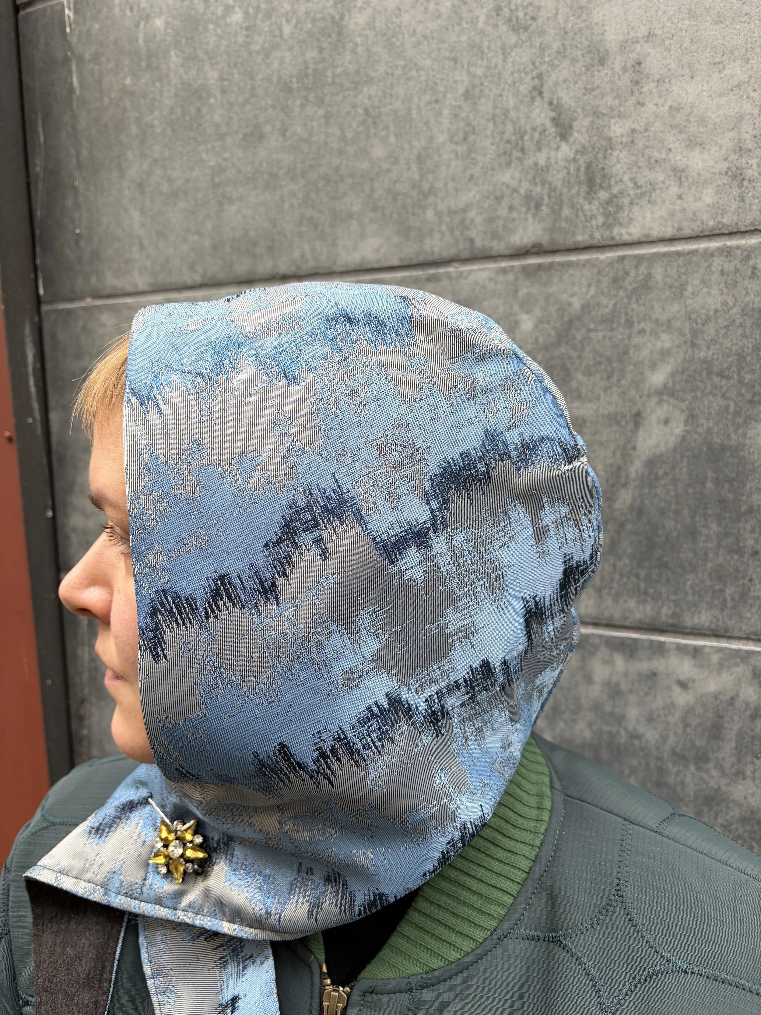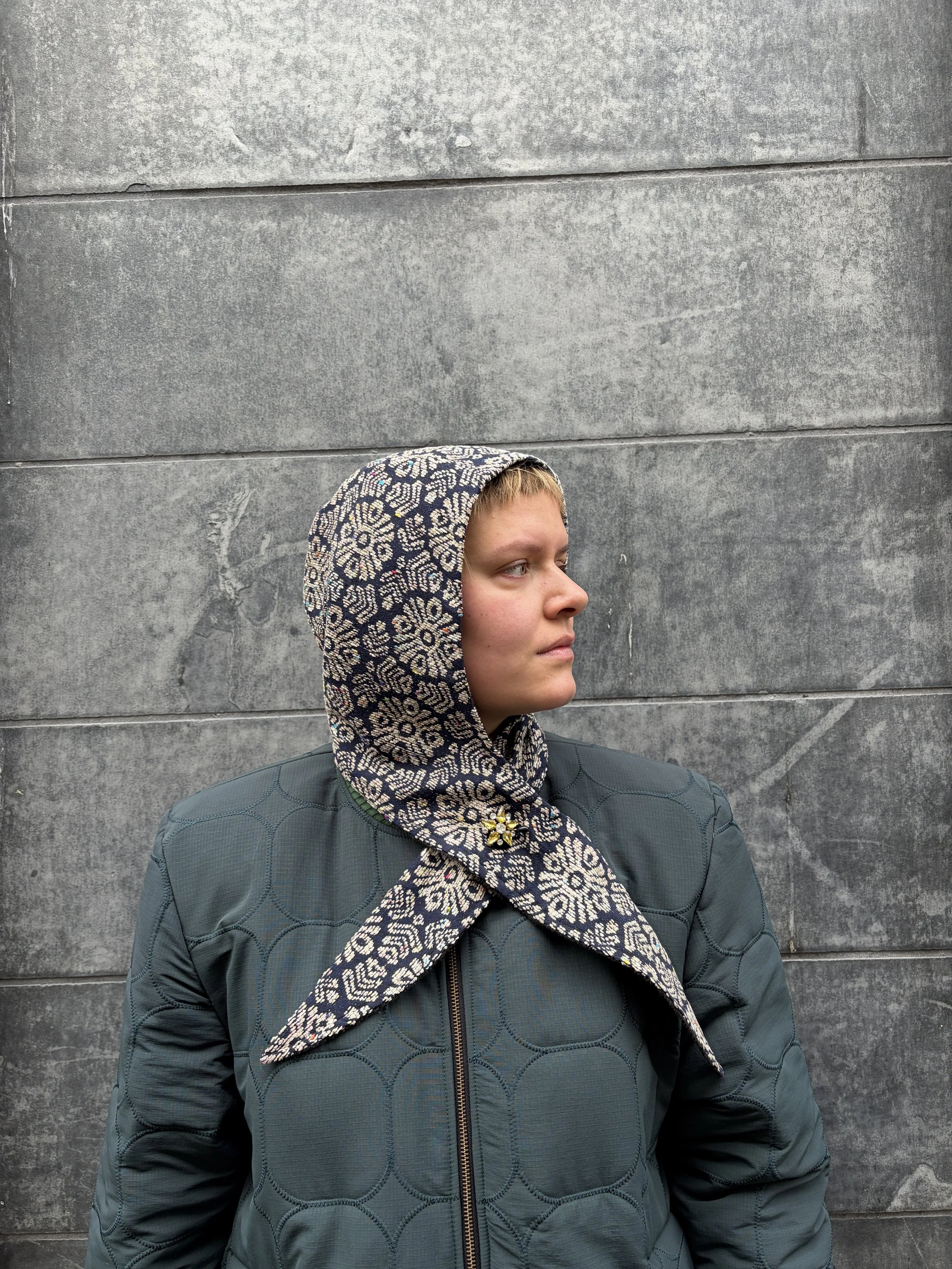 A sculpted hood in brocade and wool—made one by one in Berlin, a small gesture of warmth shaped by hand.