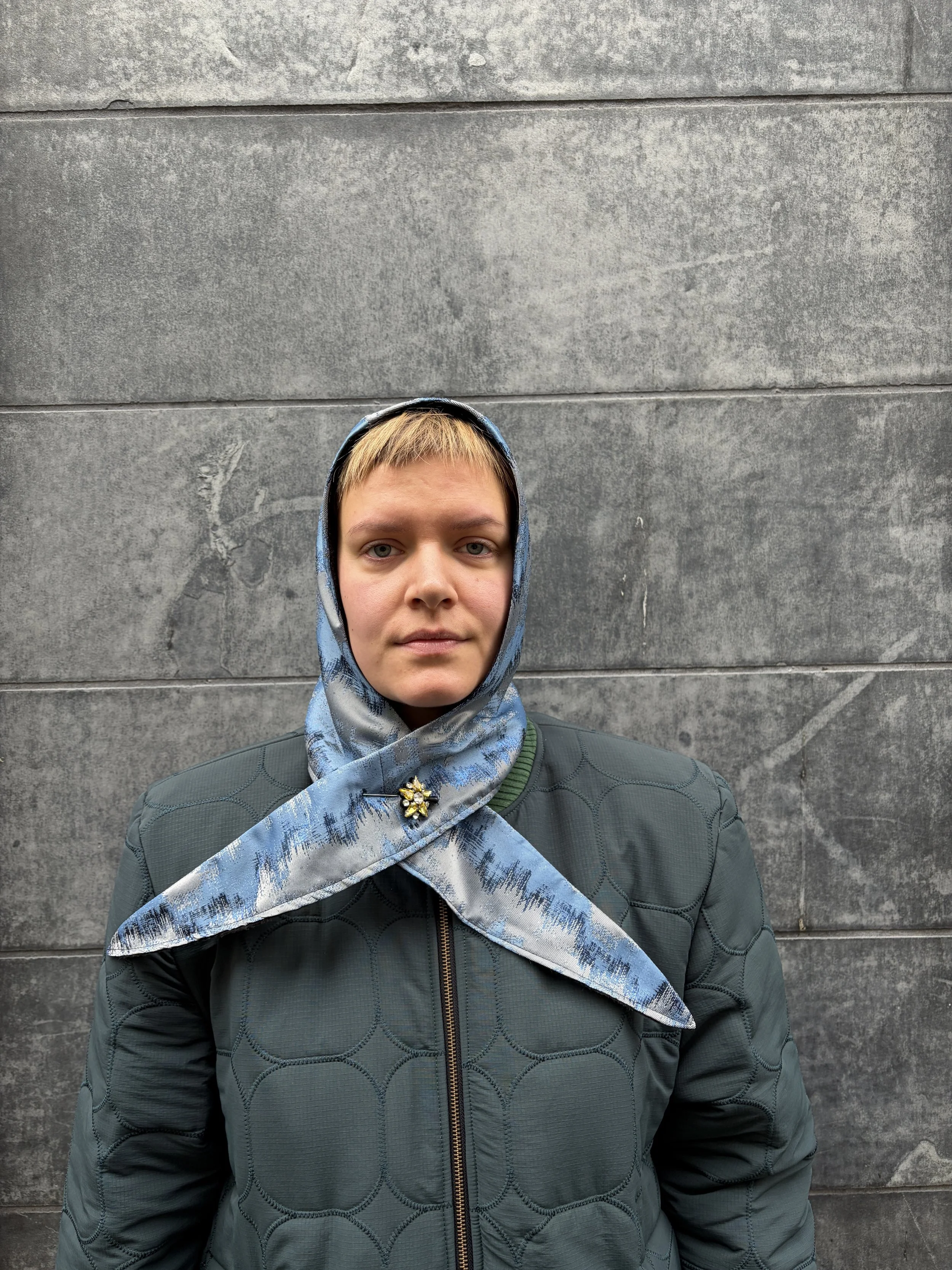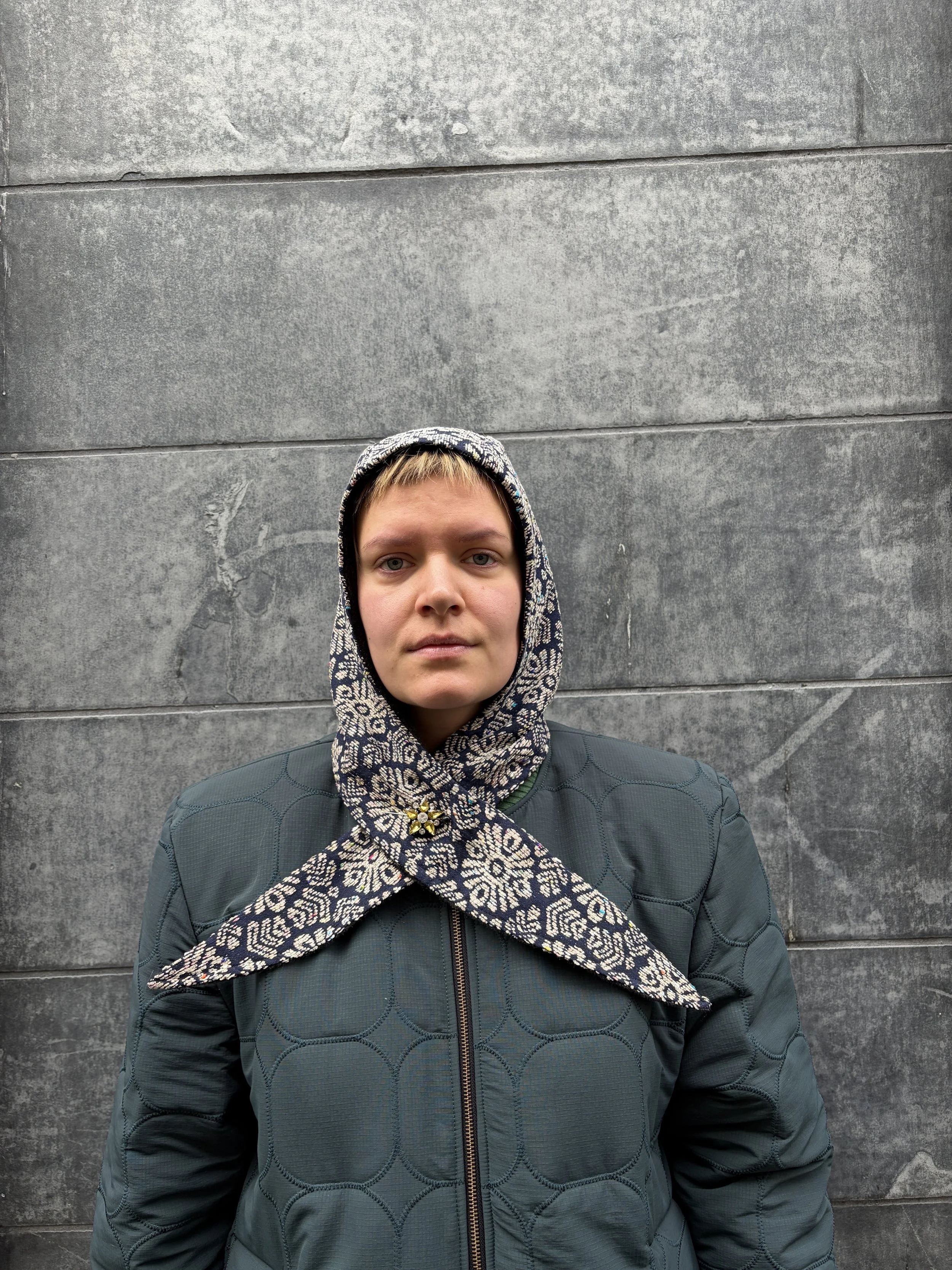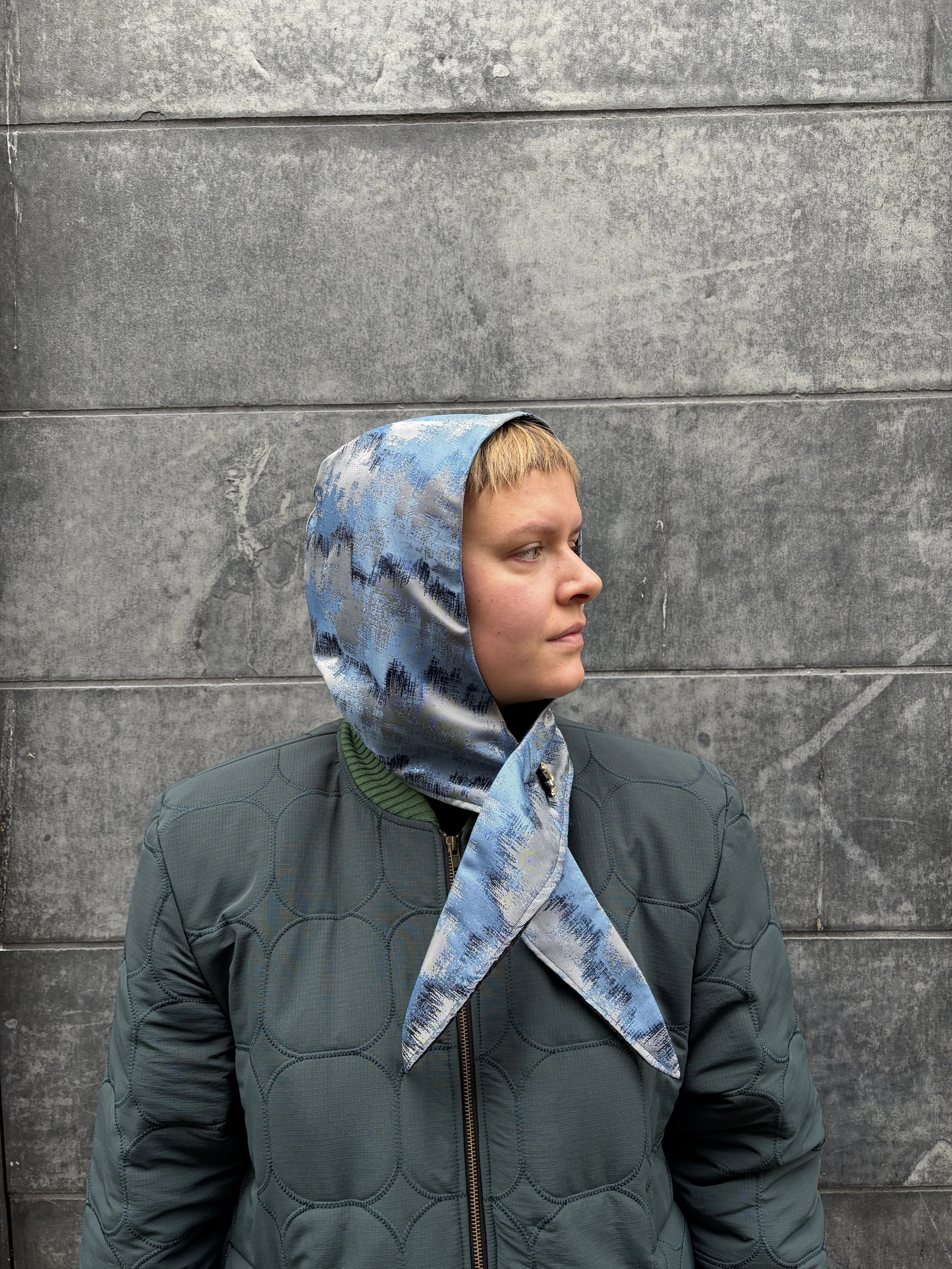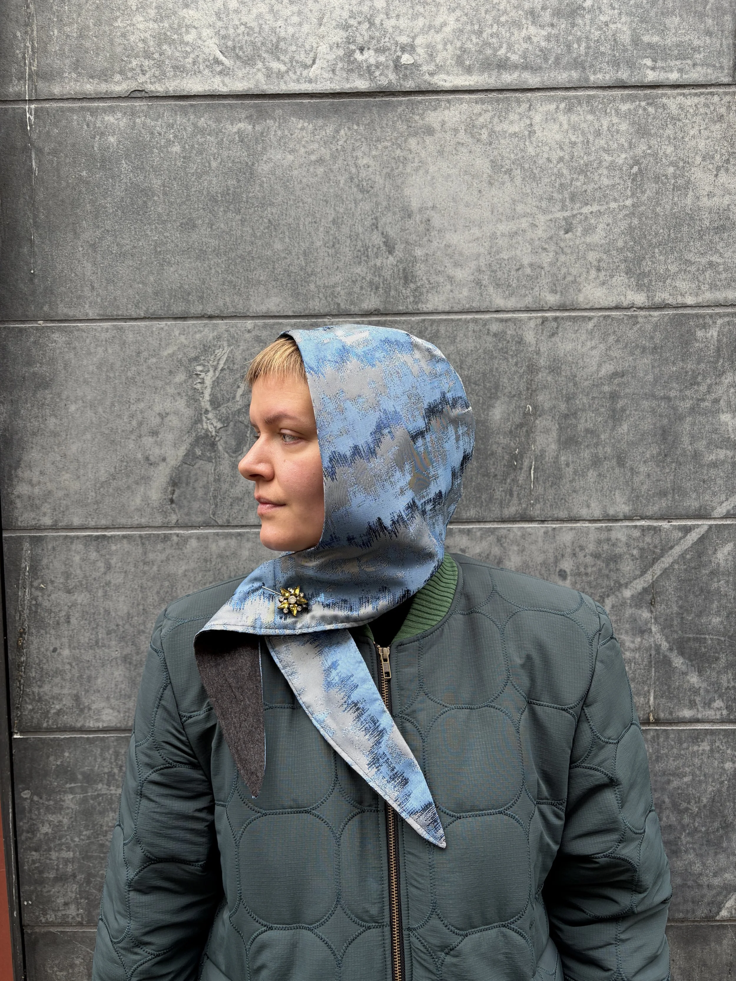 A structured hood crafted from French brocade on the outside and soft 100% wool on the inside. Designed to be worn tied under the chin or crossed at the chest, this piece frames the face and offers warmth with a sculptural silhouette. Each hood is made individually in Berlin.