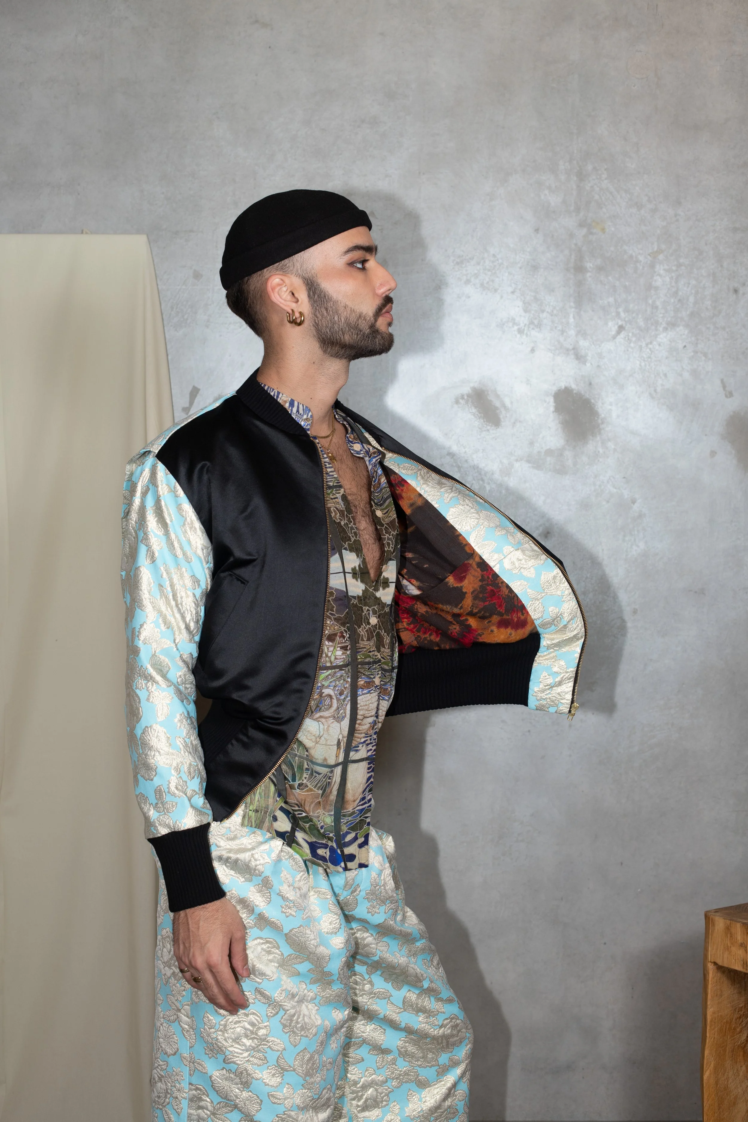 A relaxed-fit reversible bomber that combines color and art. One side is crafted from solid blue neoprene, while the reverse features a printed fabric inspired by Franz Marc’s “Blaues Pferd” (Blue Horse). The silhouette is structured yet soft, with ribbed cuffs and hem creating balance between volume and ease.